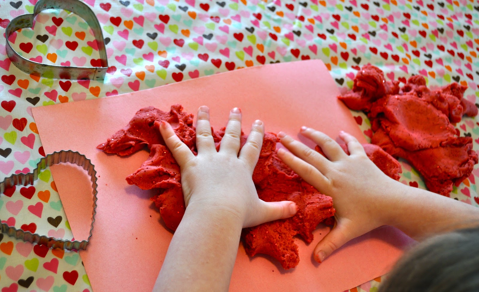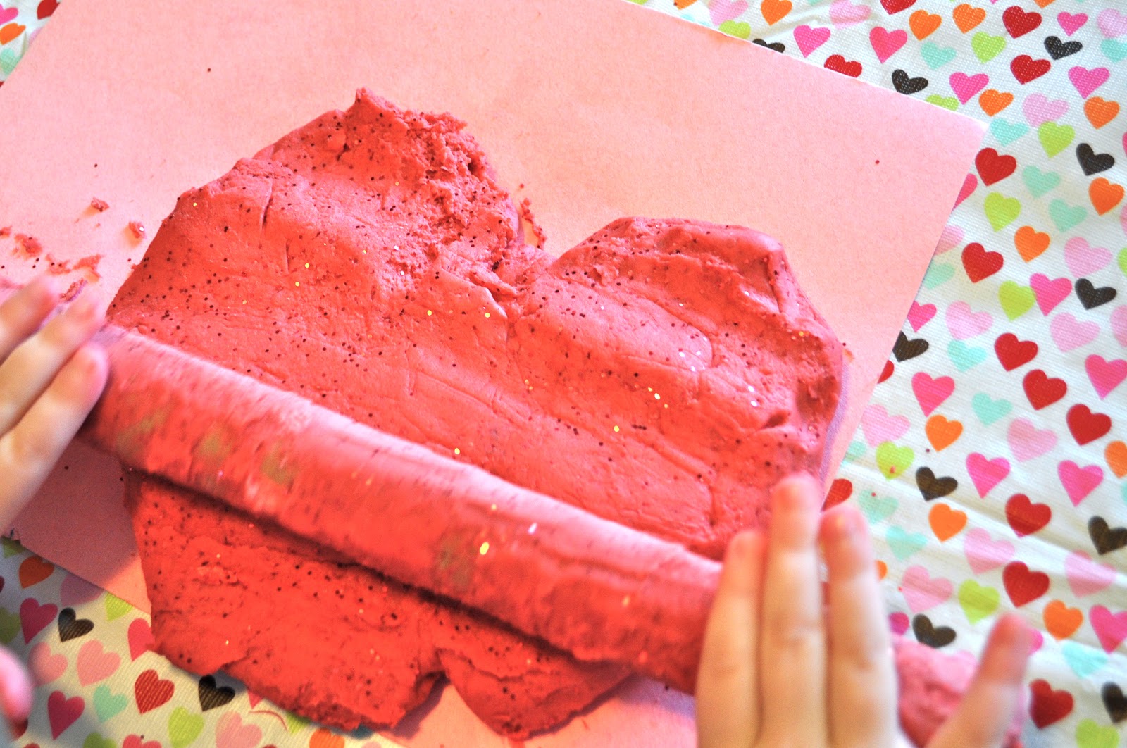 My kids and I wanted to try making some play dough for Valentine’s Day this past weekend, so I made up an easy batch of play dough with an extra bonus- glitter!