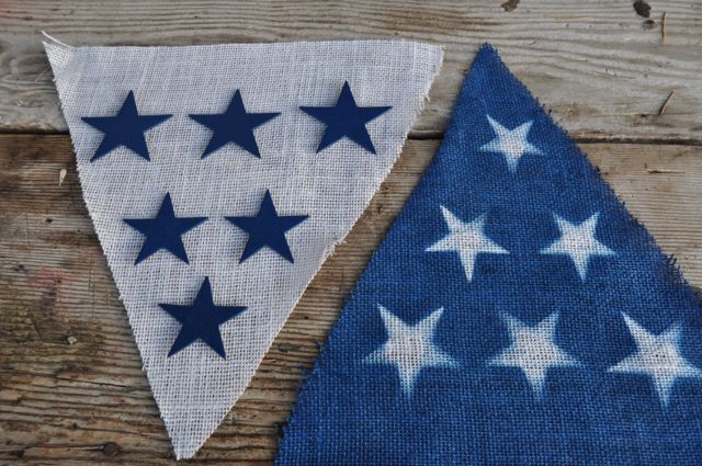 Some triangles have red and white stripes, and others have a blue background with white stars, all made with inexpensive (and very forgiving) burlap and spray paint.