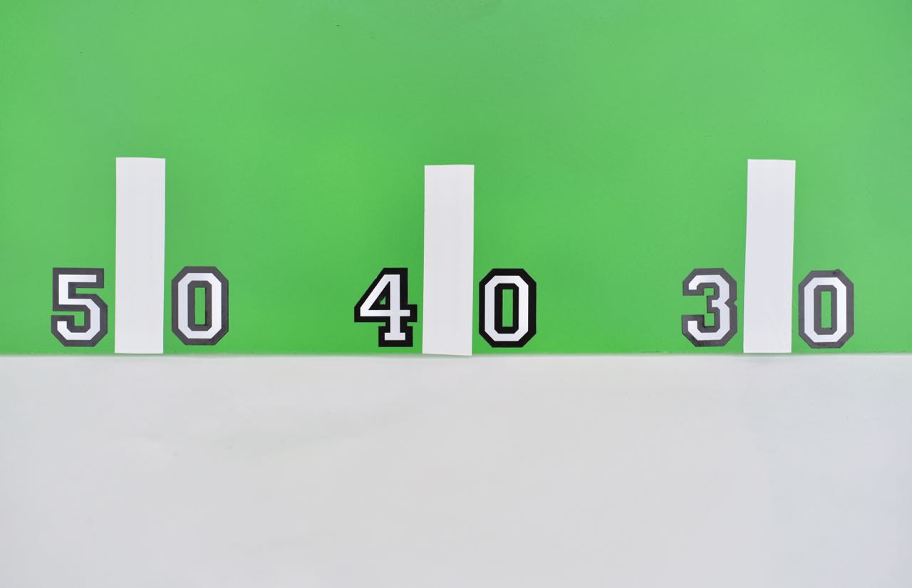 Step 4. Now it’s time to add the numbers. Starting with the 10 yard line at the top, place the 1 to the left of the top piece of tape, then the 0 to the top right of the piece of tape.