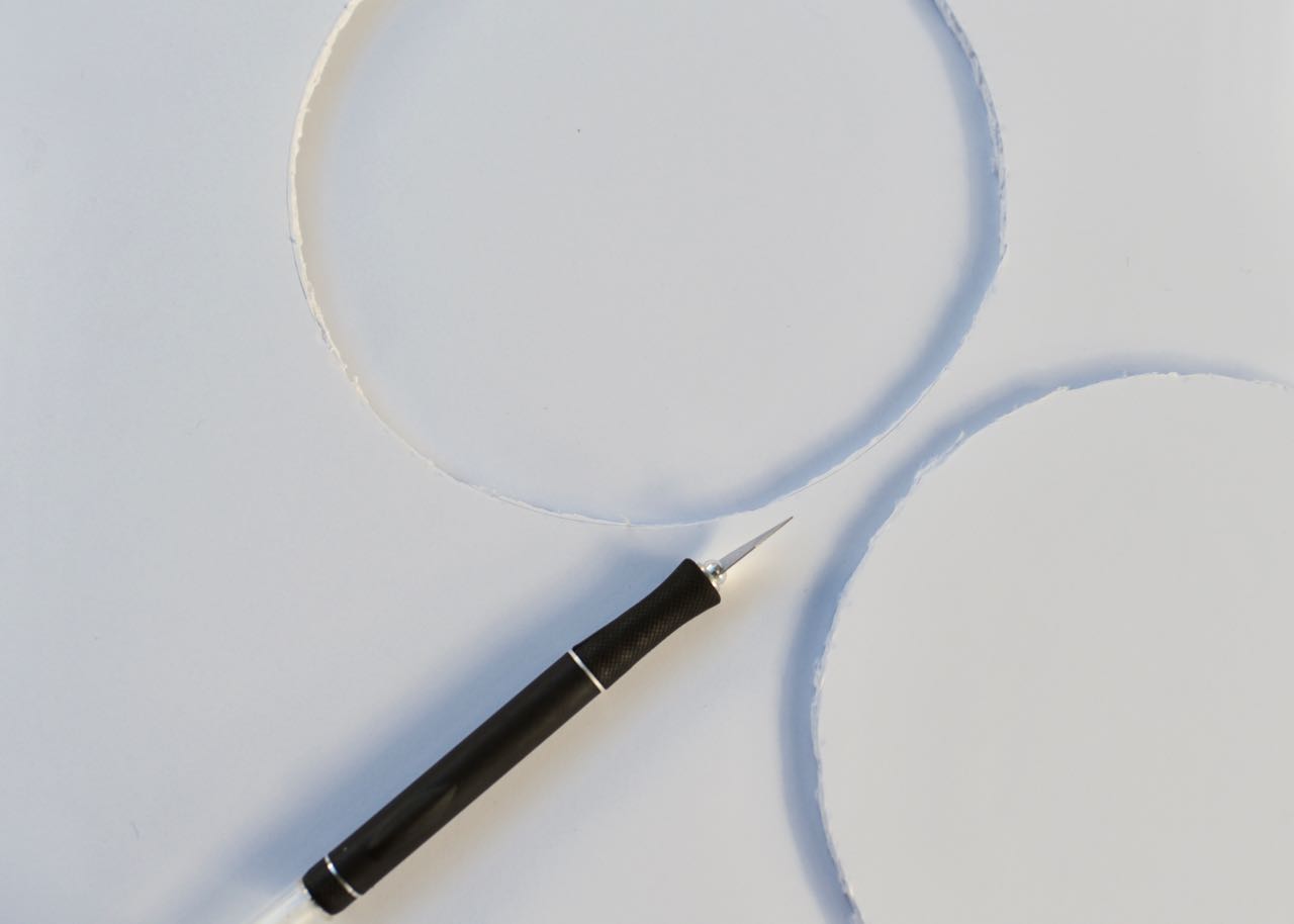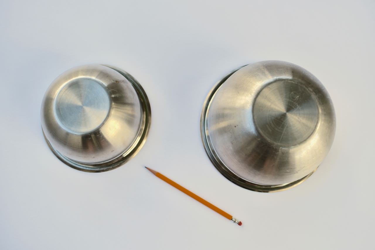 Step 1. Trace two circles onto your foam board. Make sure they’re evenly spaced and centered. Tracing around two of my metal mixing bowls worked perfectly! Use a craft knife to cut all the way through the foam around your pencil lines.