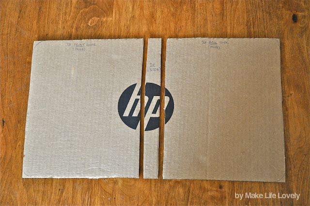 1. Cut out two pieces of cardboard that are 8″x10,” and one thin piece that is 1″x10.” Line up the cardboard as pictured, so that it looks like an open book. Label all of the pieces- I labeled mine “Top front cover (inside),” “Top inside,” and “Top back cover (inside).” And on the back “Top front cover (outside),” “Top outside,” and “Top back cover (outside).” It really helped to have these labeled, so don’t skip this step!