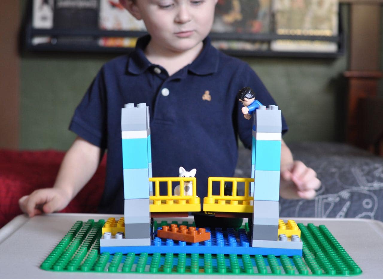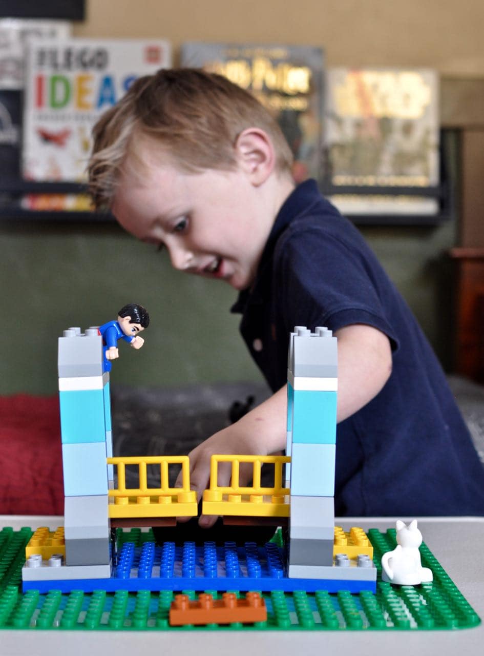 After building the bridge from his set, a light went on in his head and his face lit up as he realized the bridge pieces could move.