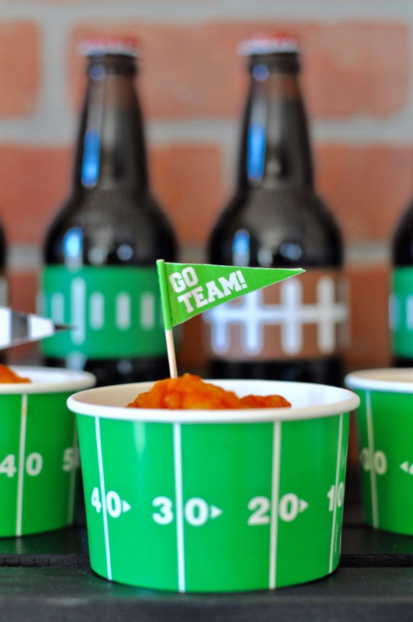 Paper chain pieces that were supposed to be taped into a long chain decoration were perfect as drink bottle decor. Each root beer bottle was wrapped with a colorful strip of paper and taped on so that it all matched the football theme. Such a fun addition to the party, and so easy to make!