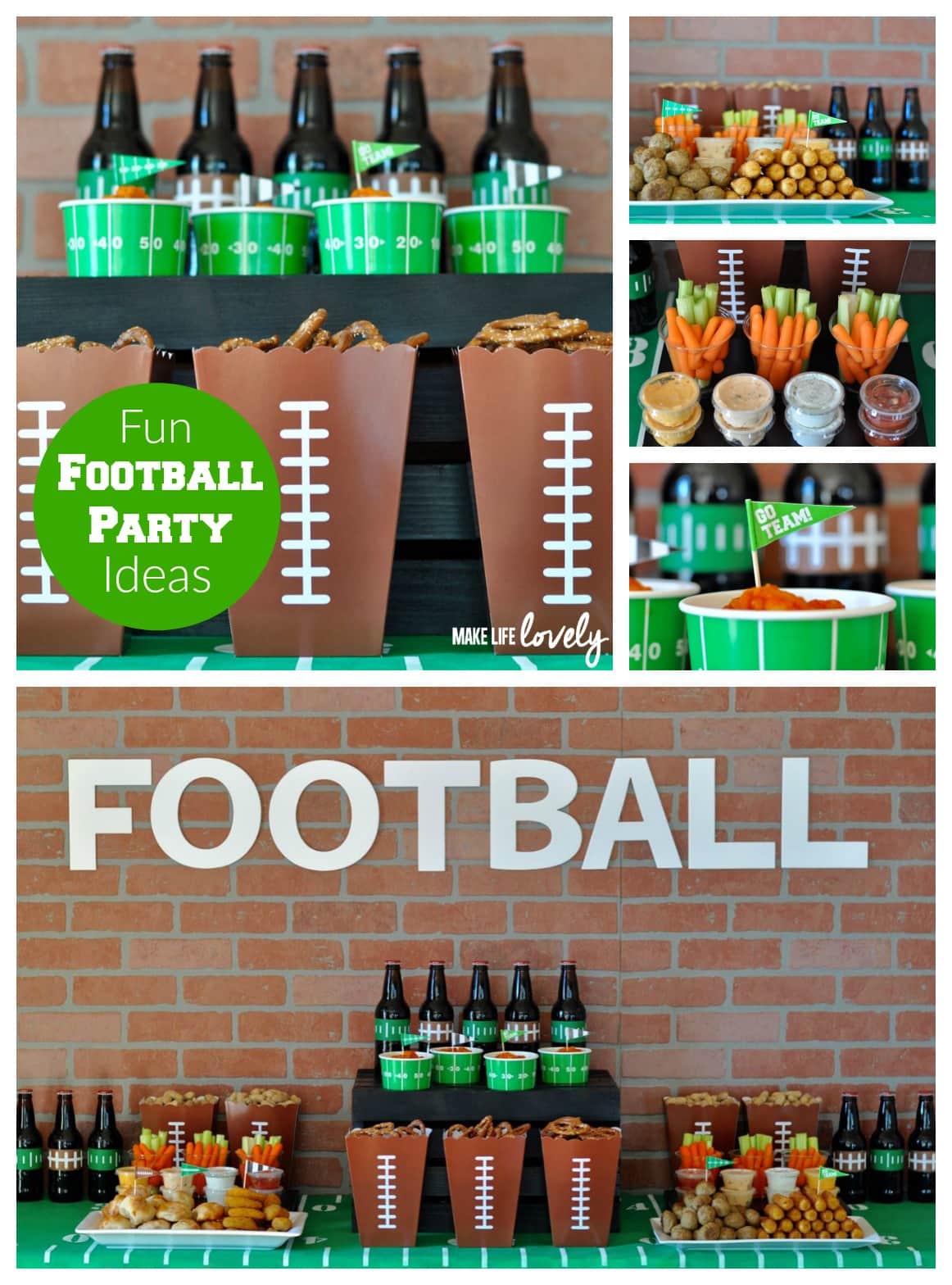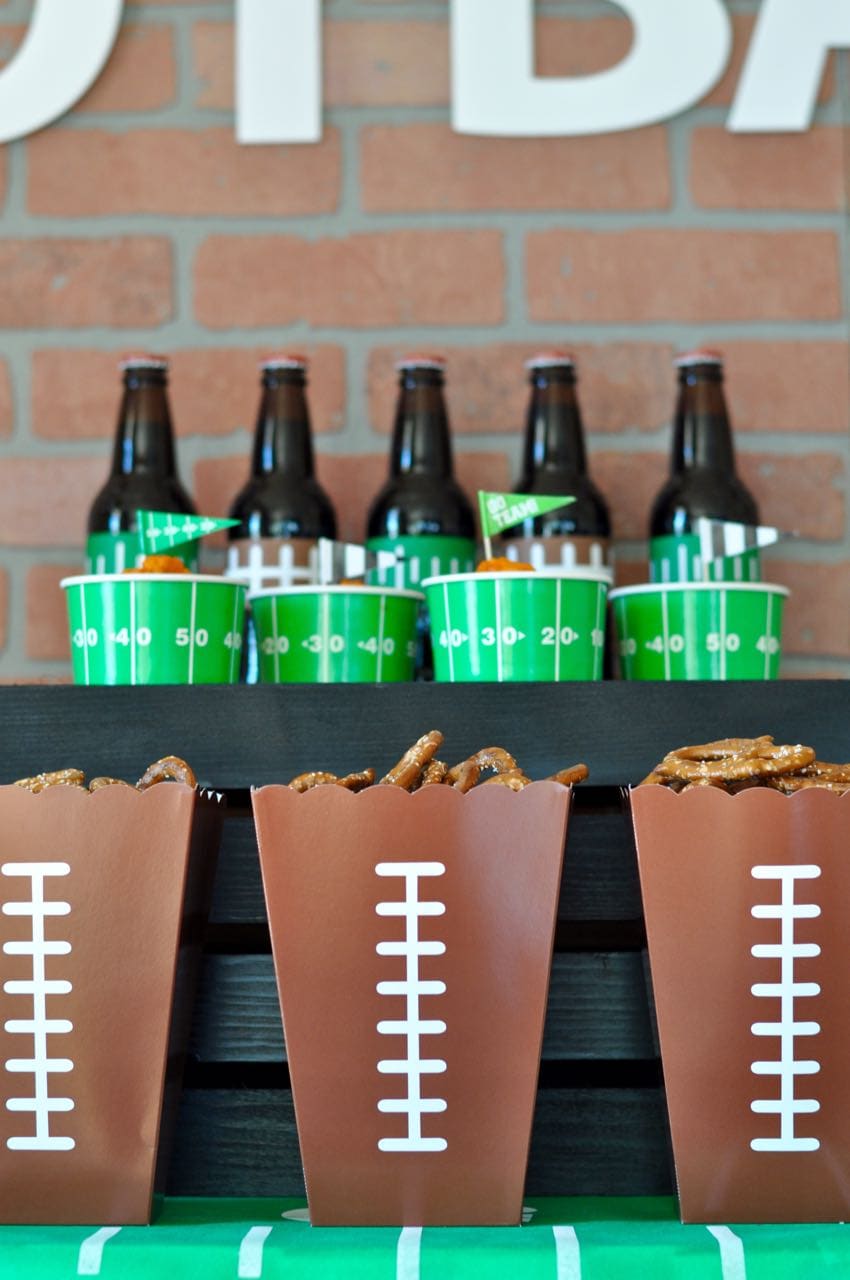 First of all, you can’t have a football party without a great looking table, right? I covered my table with a green football field table cover and pushed it up against the wall. Brick paneling made the perfect background for the party!