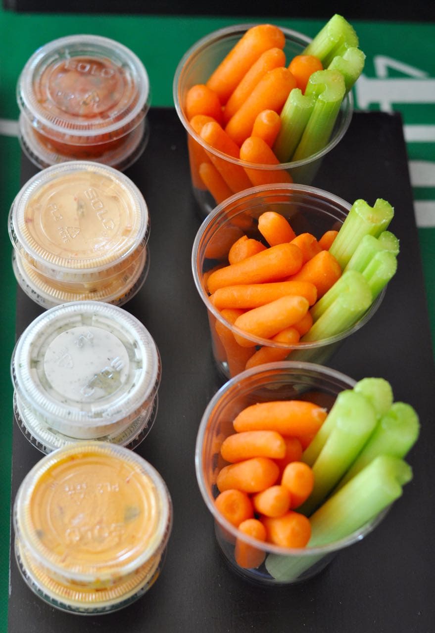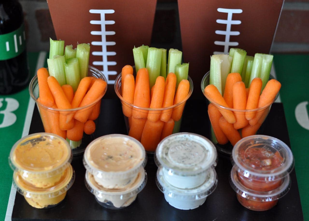 Clear plastic cups were filled with cut celery sticks and crunchy carrots, and placed behind the sauces. Behind those were adorable large football treat bags filled with salted peanuts in the shell.