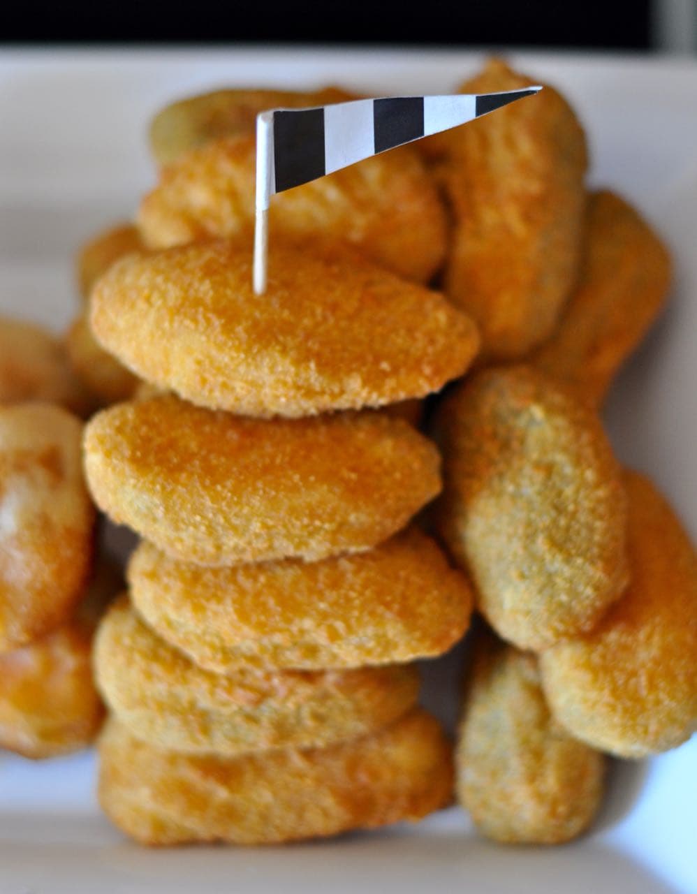 I stacked all of the football finger food on some classic white rectangular platters, then added some football-themed food flags.