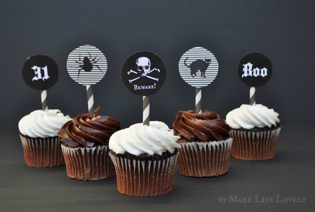 Just download and print my free Halloween cupcake topper printables onto white card stock, cut out the circles, stick onto a toothpick or cut striped straw, and you’ll be good to go!
