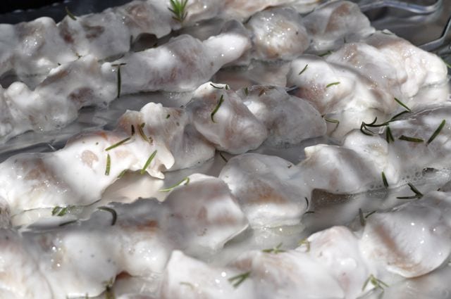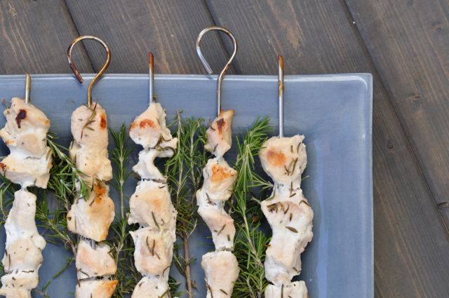 Once the chicken has marinated, add chicken to the metal skewers, and place on a baking sheet covered with Reynolds non-stick foil. I have some fresh rosemary in the yard, so I sprinkled some on the chicken just before grilling for some extra flavor.
