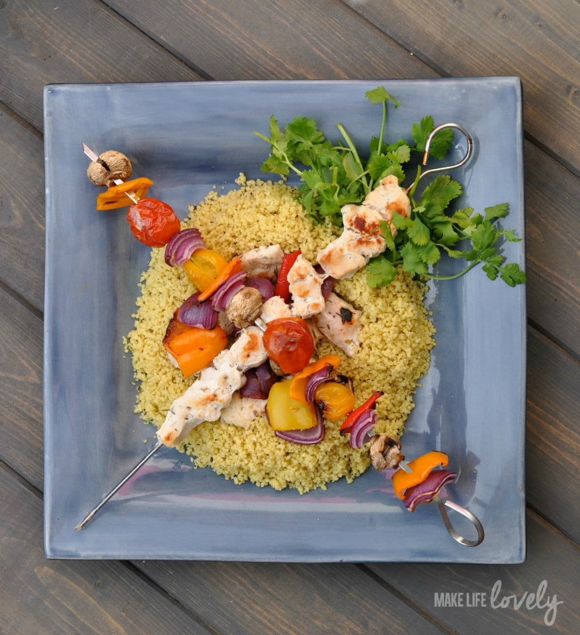 As a teenager I would help make these for my family all the time and grill them in the backyard. Onions, bell peppers, mushrooms, and tomoatoes all complement the delicious grilled chicken flavor, and when served on a bed of cous cous, it’s pure heaven.