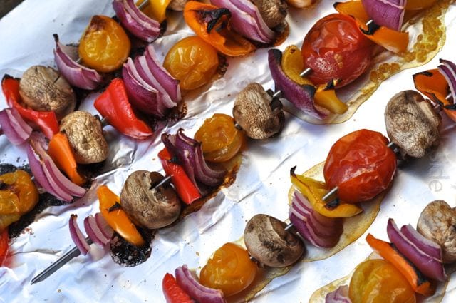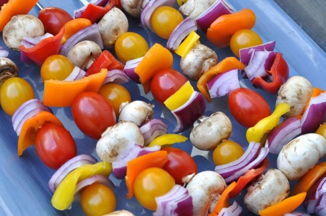 You can combine the vegetables and the chicken together on the skewers or put them on separate skewers.