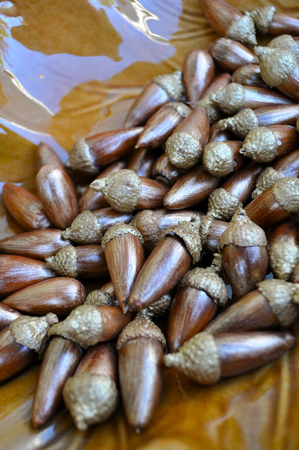 I love the way these gorgeous bronze and gold acorns look in my Pottery Barn leaf bowl.