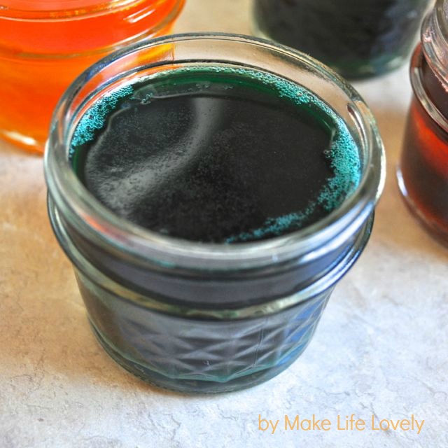 STEP 4. Once the crystals are completely dissolved, pour the mixture evenly into six small glass jars (see my photo). The small mason jelly jars I used were the perfect size!