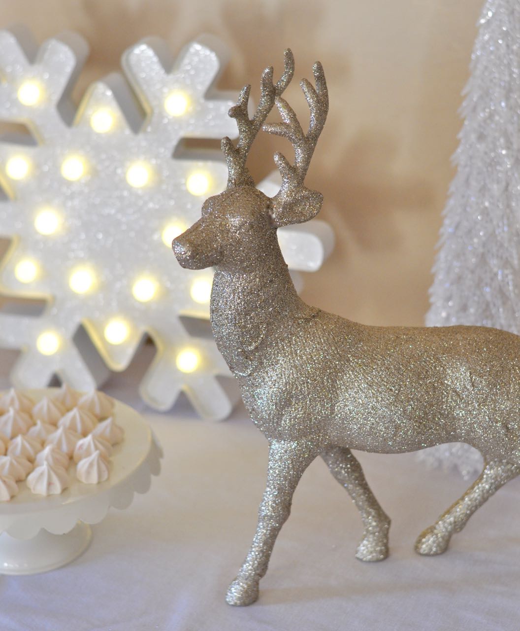 I bought a lovely glittery deer, two snowflake marquee lights, two glistening Christmas trees, large silver glitter snowflakes, and more. I wanted my party to look light and airy and sparkly.