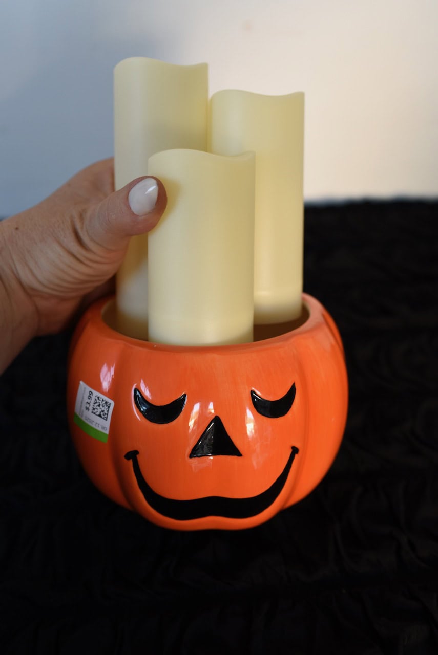 This sweet pumpkin with candles is perfect for decorating for Halloween.