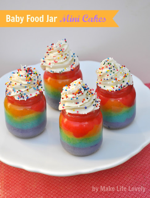 You might remember these mini cakes from when I shared with you my Rainbow Cake in a Jar baked in a baby food jar. My Monsters University cupcakes are very similar, just without all of the layers of color, and with bright colors of frosting!