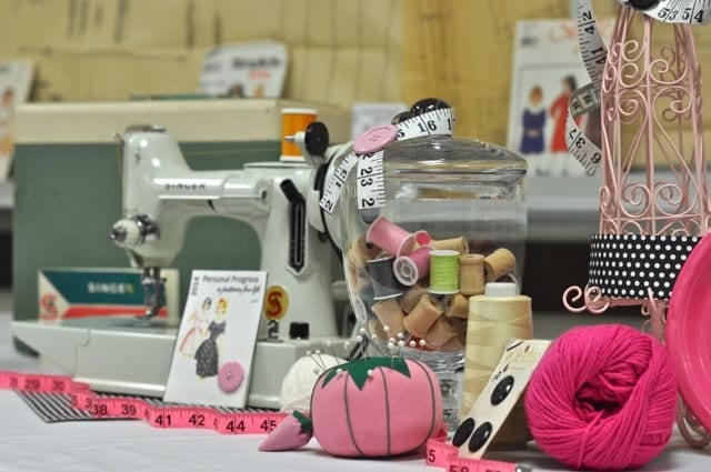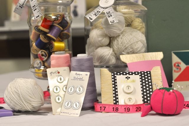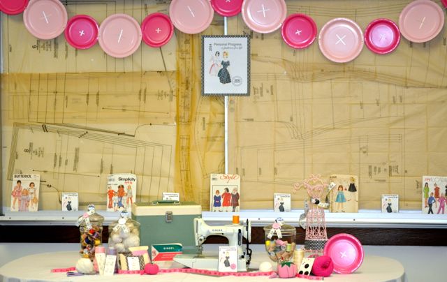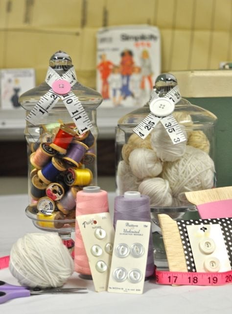 I found some amazingly cute pink pin cushions that added some color to the table, as well as a hot pink measuring tape, large spools of thread, more yarn and a large button that matched the large button garland I made for the front of the room. (Tutorial for that coming soon!)